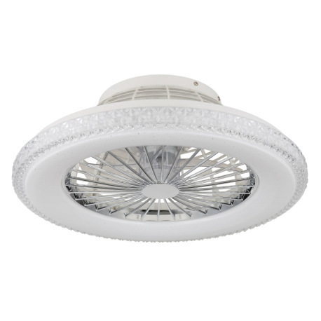 Stropný ventilátor, kov chróm, plast biely/chróm, číre akrylové krištále, stmievateľné, pamäť, diaľ.
