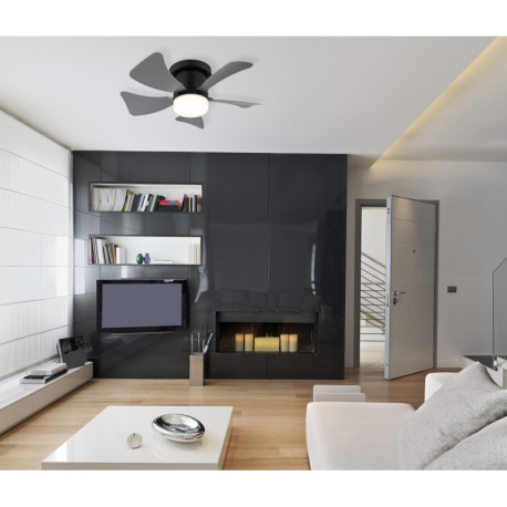 Stropný ventilátor, kov čierny matný, plast sivý/biely, stmievateľný, niekoľko úrovní pomocou násten