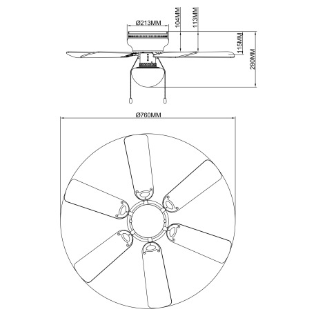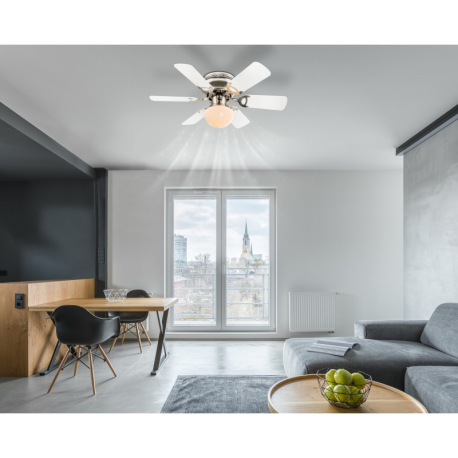Stropný ventilátor, sklo, nikel matný, MDF grafit a biela, 3 rýchlosti, 2 smery otáčania, ťahový vyp