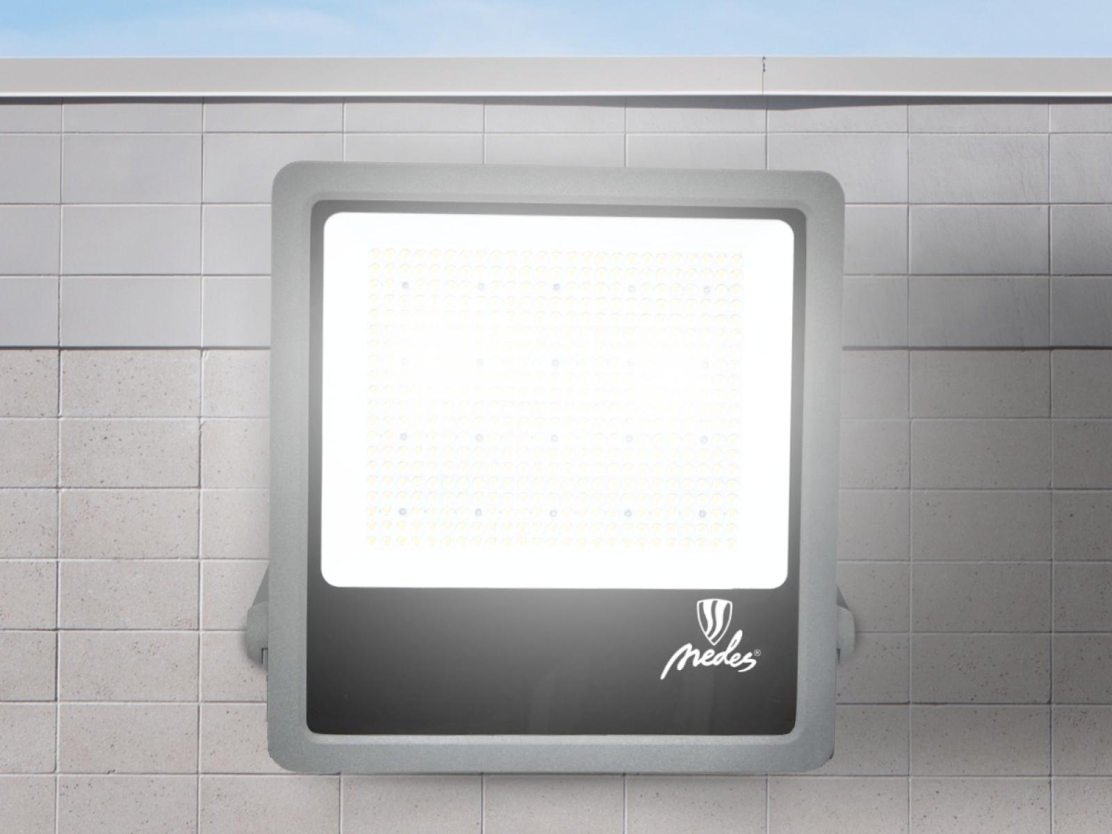 LED reflektor LF4028S v šedej farbe, s výkonom 300W, svietivosťou 45000Lm a farbou svetla 5000K disponuje držiakom a vysokokvalitným LED čipom.