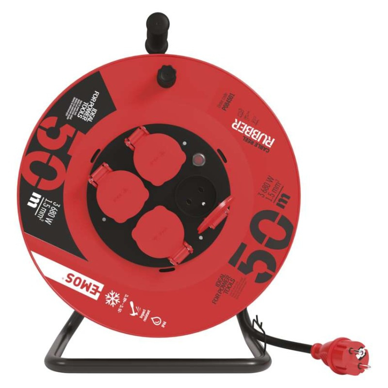 Vonkajší predlžovací kábel na bubne 50 m / 4 zásuvky / čierny / guma / 230 V / 1,5 mm2