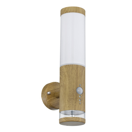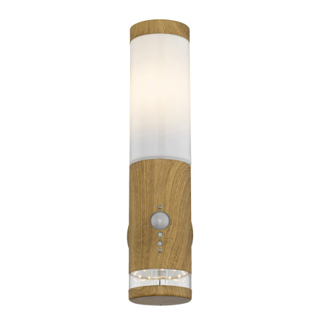 Vonkajšie svietidlo, oceľ vo vzhľade dreva, plast opál, dekoratívna LED, IP44, senzor 90°, dosah 8m,