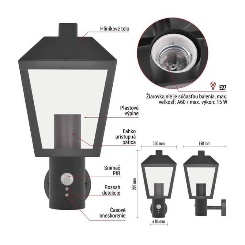 Záhradné nástenné svietidlo ADENIA, senzor súmraku, 19,8 x 15 x 29,8 cm, 1 x E27, 15 W