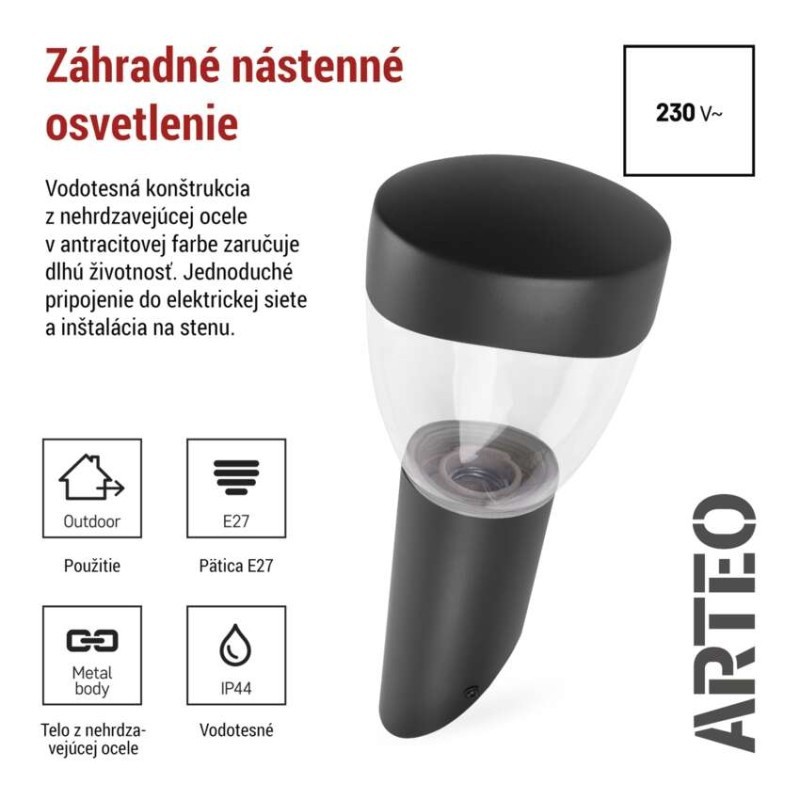 Záhradné nástenné svietidlo ARTEO, 12 x 12 x 33 cm, 1 x E27, 15 W