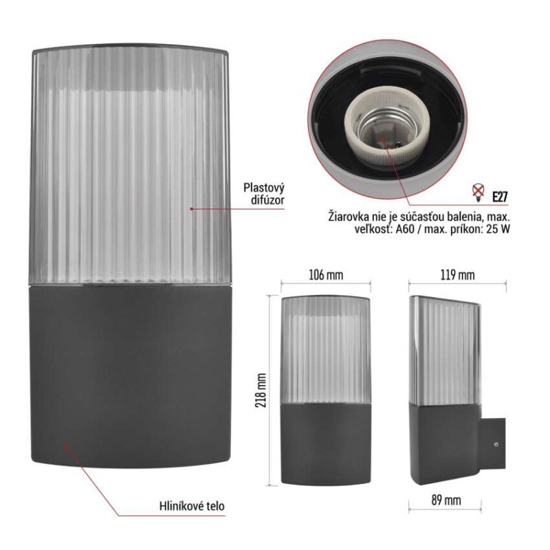 Záhradné nástenné svietidlo LANA, 11,7 x 10,6 x 21,8 cm, 1 x E27, 25 W