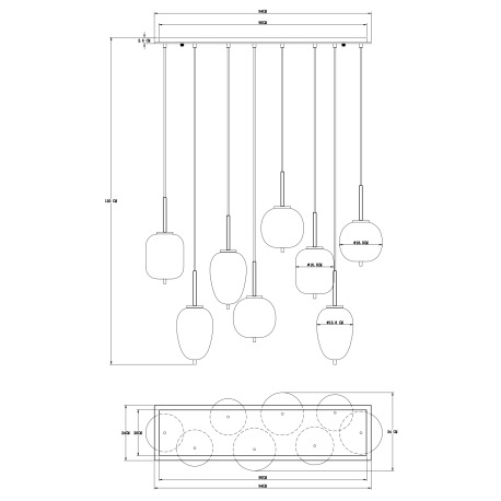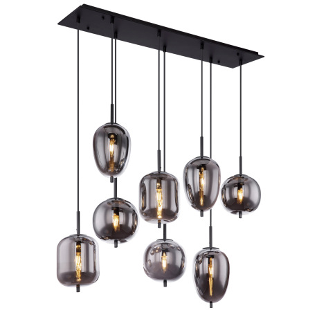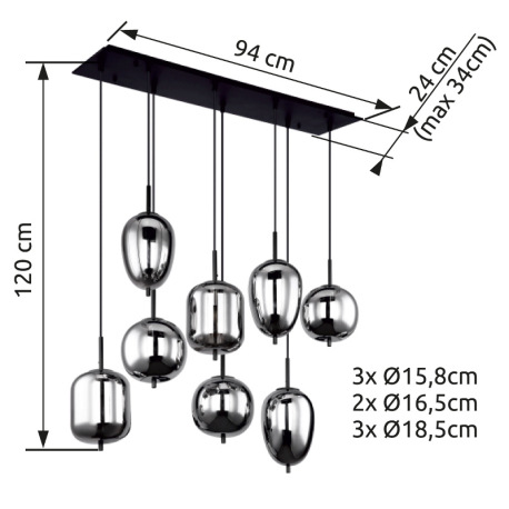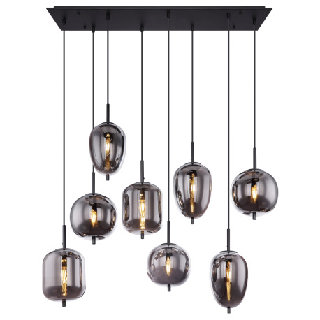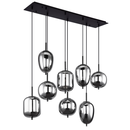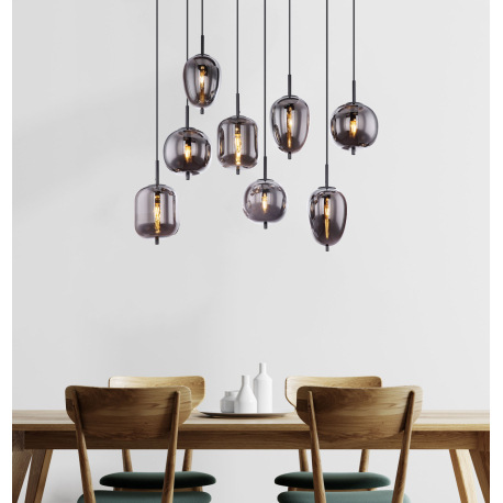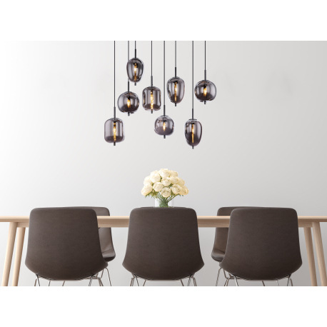 Závesné svietidlo, čierny kov, dymové sklo, rôzne tvary skla, DxŠxV: 940x340x1200, bez žiaroviek 8xE
