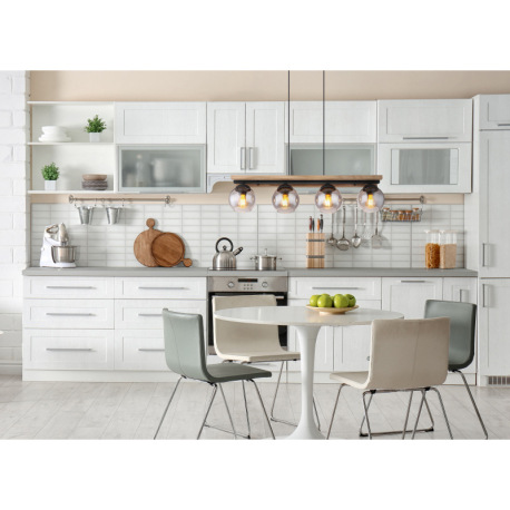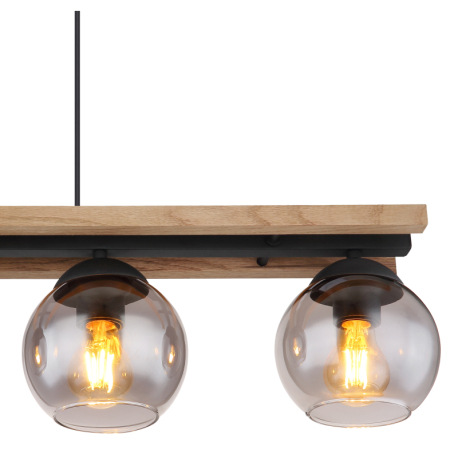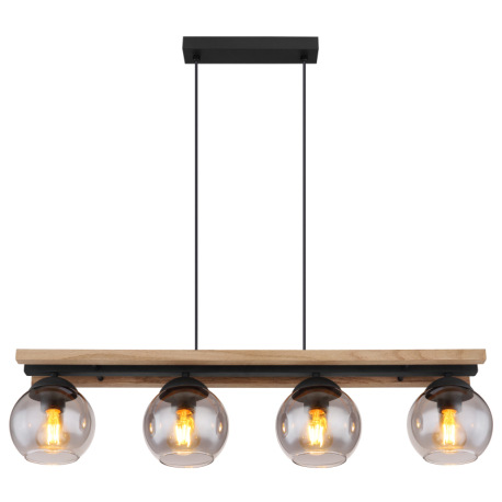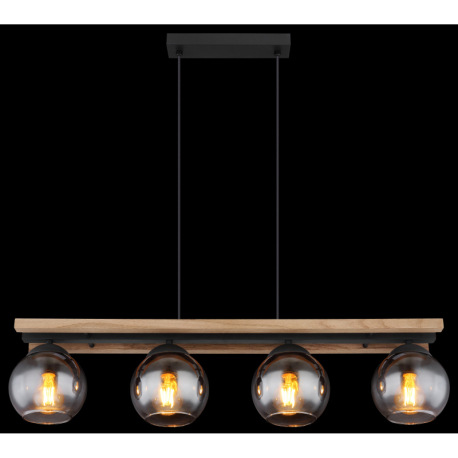 Závesné svietidlo, čierny matný kov, tmavohnedé drevo, sklo dymovej farby, čierny PVC kábel, možnosť