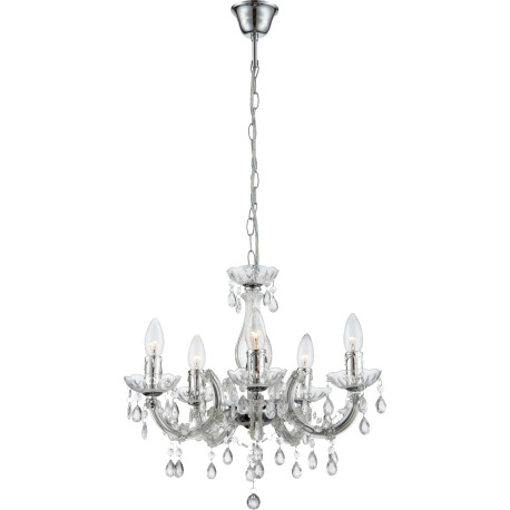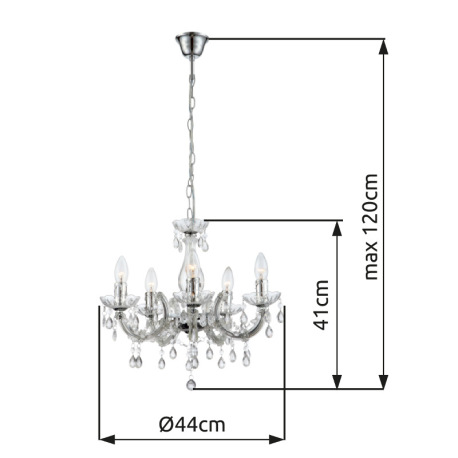 Závesné svietidlo, kov, chróm, akrylové krištále priehľadné, Ø 440, V:1280, bez žiaroviek 5xE14, max