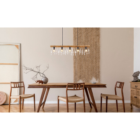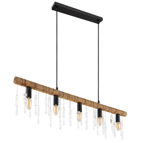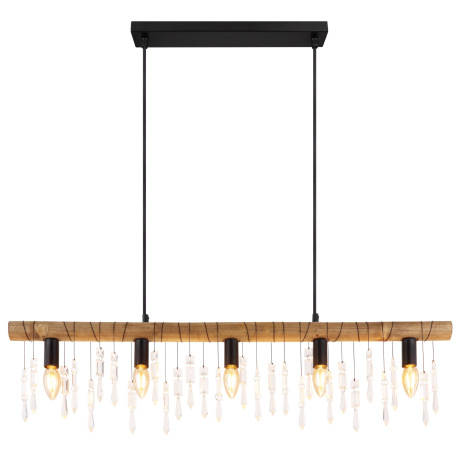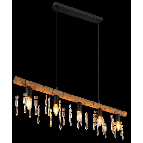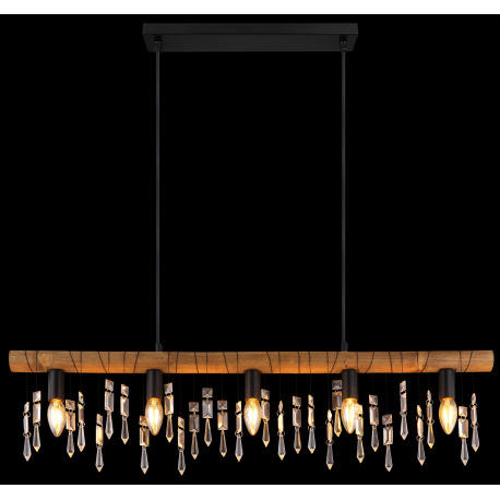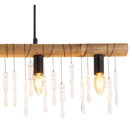 Závesné svietidlo, kov čierny, drevo hnedé, sklenené krištále, textilný čierny kábel, DxŠxV:900x60x1