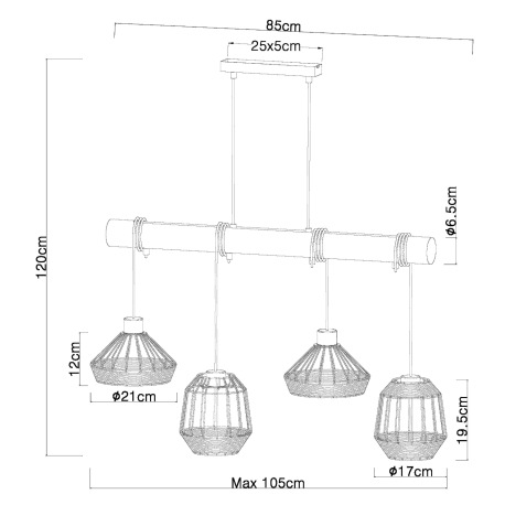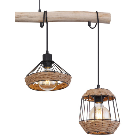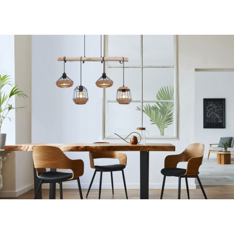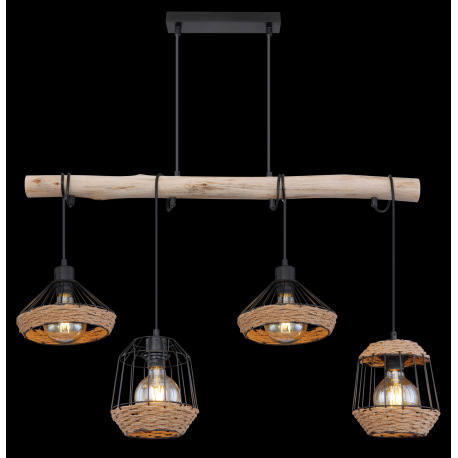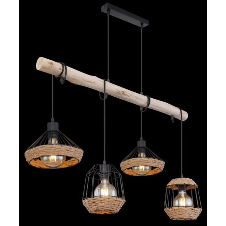 Závesné svietidlo, kov čierny matný, drevo, konopné lano, DxŠxV: 1050x210x1250, bez žiaroviek 4xE27,