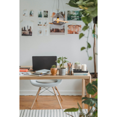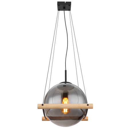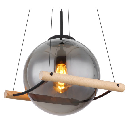 Závesné svietidlo kov čierny matný, drevo prírodnej farby, sklo dymovej farby, kábel PVC čierny, výš