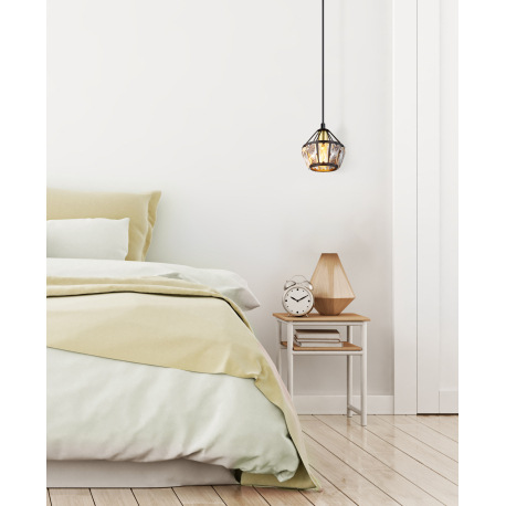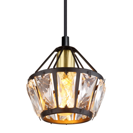 Závesné svietidlo, kov čierny matný, kov mosadz, kovové tyče čierne matné, sklenené krištále priehľa