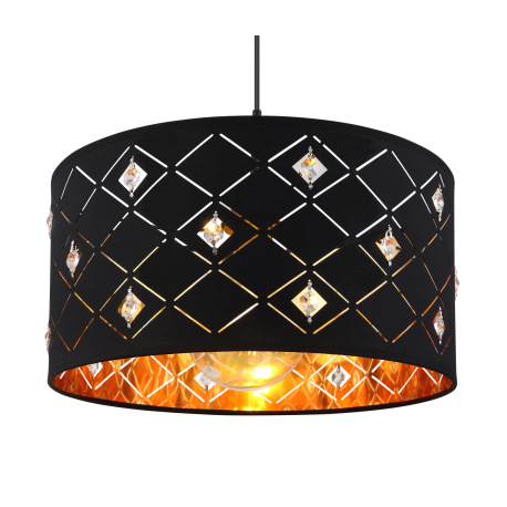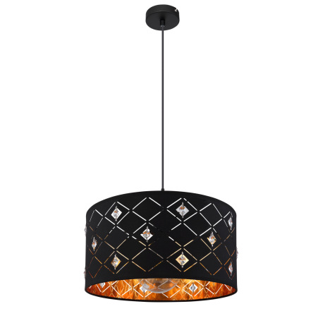 Závesné svietidlo, kov čierny matný, textil čierny, akryl, krištále priehľadné, tienidlo z vnútra zl
