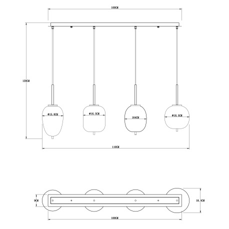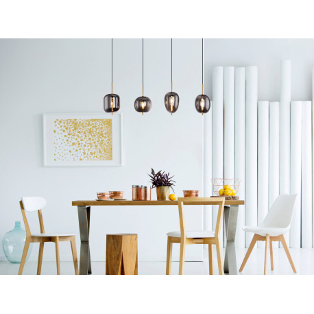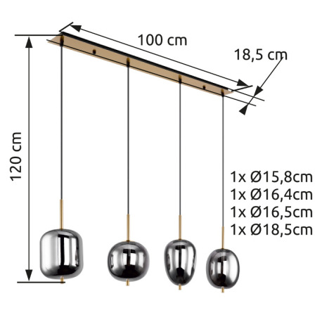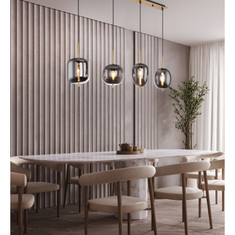 Závesné svietidlo, kov čierny, mosadz, dymové sklo, DxŠxV:1100x185x1200mm, bez žiaroviek 4x E14, max