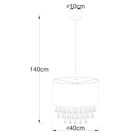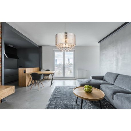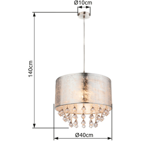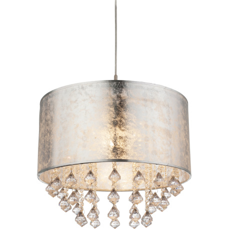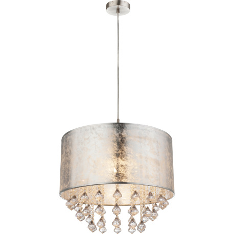 Závesné svietidlo, kov nikel matný, plast, textil strieborný, akrylové krištále priehľadné, ø 400, V