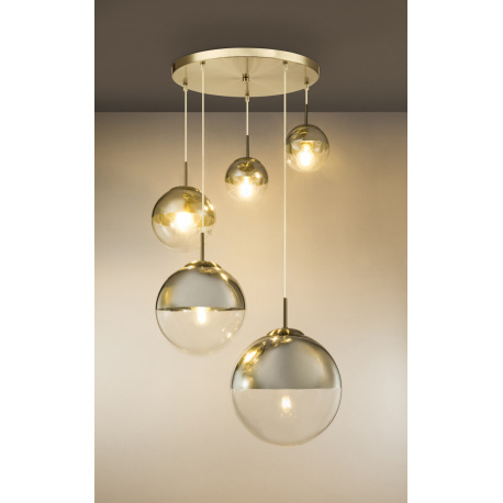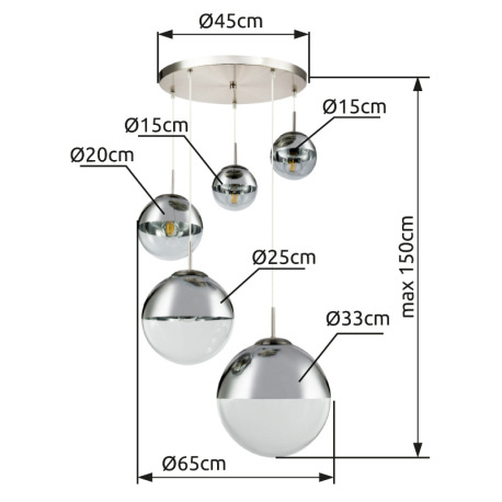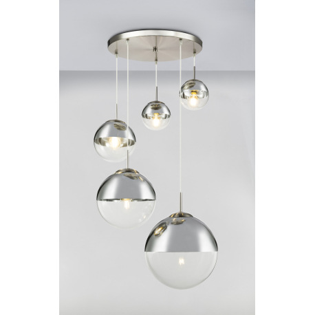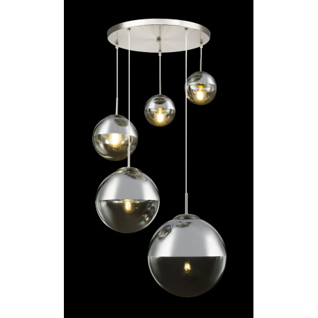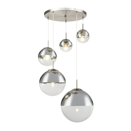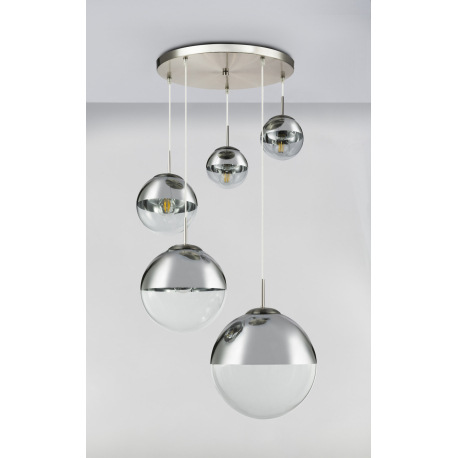 Závesné svietidlo, kov nikel matný, sklo priehľadné chróm, 5 gúľ s priemerom: 2x15-20-25-33 cm, Ø650