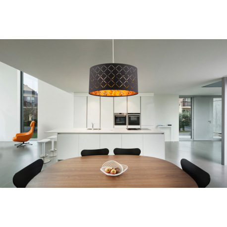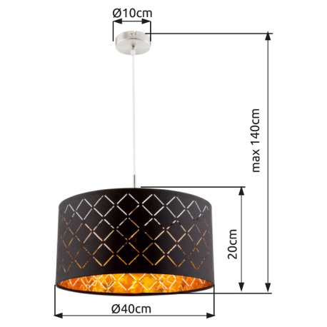 Závesné svietidlo, kov nikel matný, tkanina zlato-čierna, tienidlo s ozdobným dierovaním, Ø 400, V:1