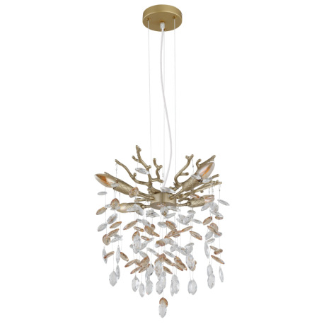 Závesné svietidlo, kov zlatej farby matný, sklenené krištále jantárové, číre, kábel PVC, výškovo nas