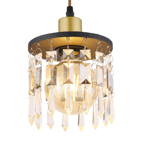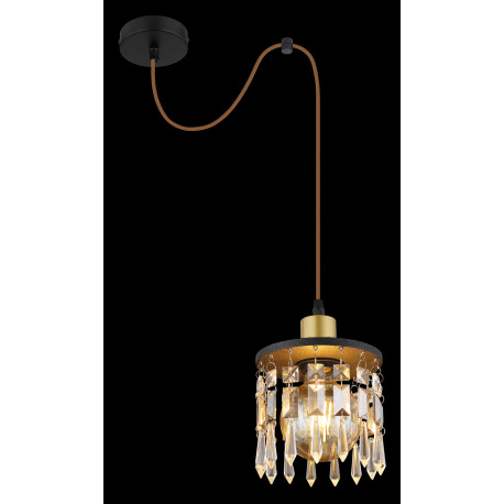 Závesné svietidlo, mosadz, drevo čierne, sklenené krištále, textilný kábel hnedý, nastaviteľná výška